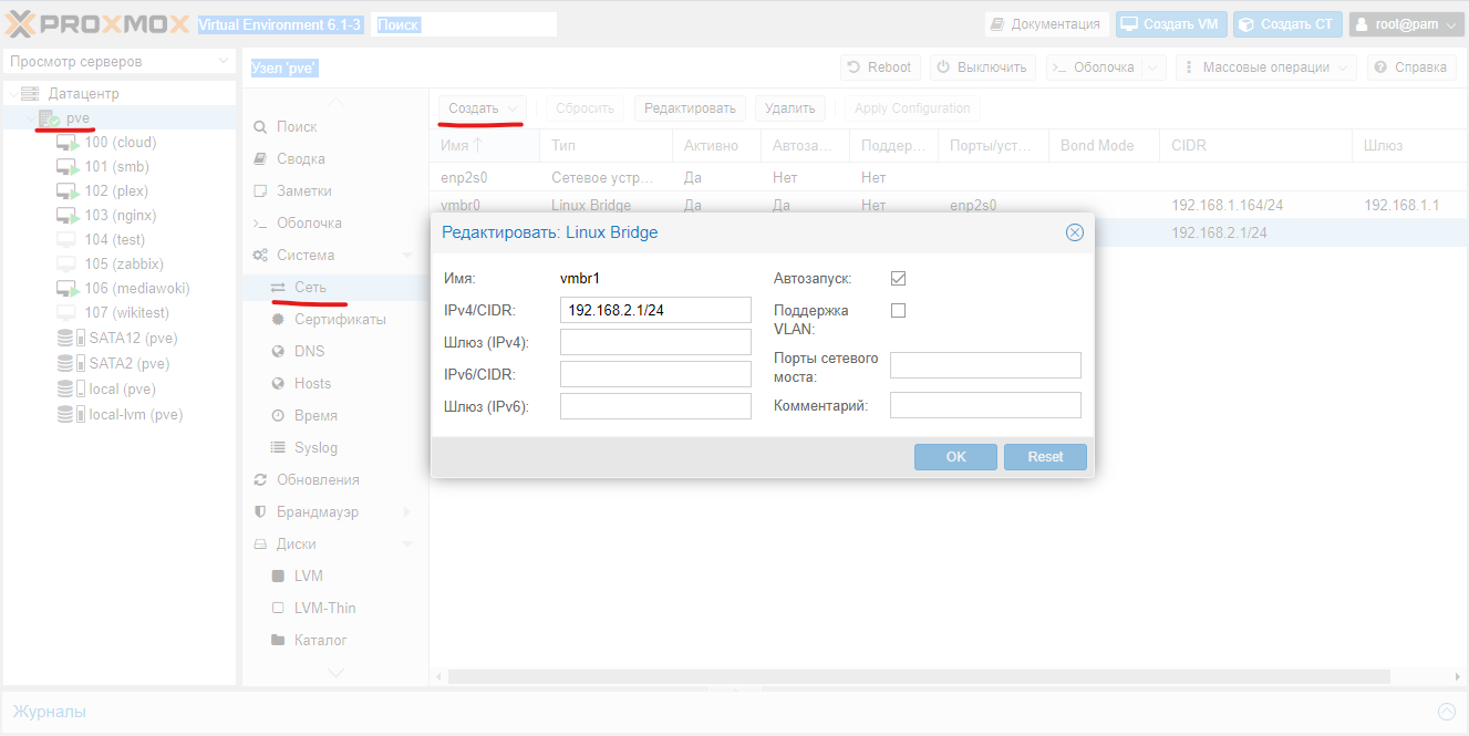 Сервер Proxmox - Демонстрация добавления виртуального сетевого адаптера