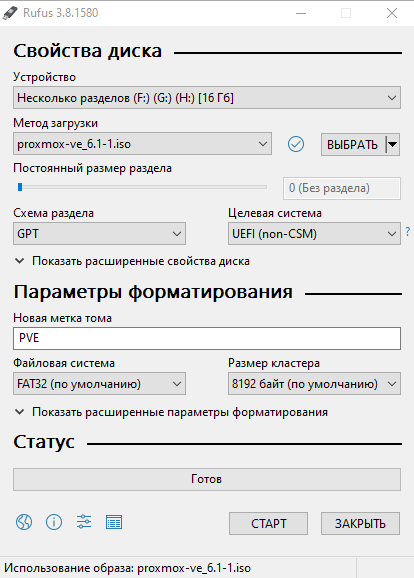 Файл:Сервер Proxmox - Демонстрация настроек Rufus.png