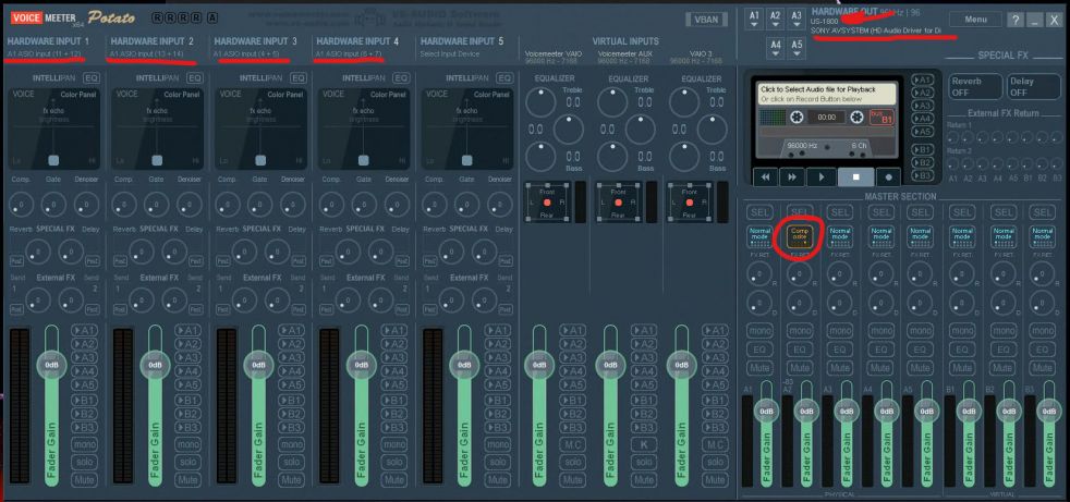 [[Файл:Снимок экрана 2024-09-09 002603 копия.jpg|без|мини|982x982пкс|VoiceMeeter - настройки входов, выбор источника и выхода]]