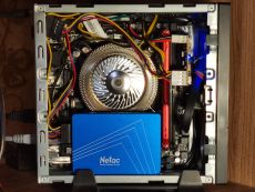 Система охлаждения очень странная. По расчету она должна была работать на малых оборотах, не слышно. Но оказалась совсем не бесшумной. Это радиатор, состоящий из пластин и крыльчатки из алюминия. Было принято решение, поставить в БИОСе порог включения вентилятора - включать минимальные обороты при достижении 65 градусов. Оказалось, что до таких температур процессор ни разу не прогрелся.